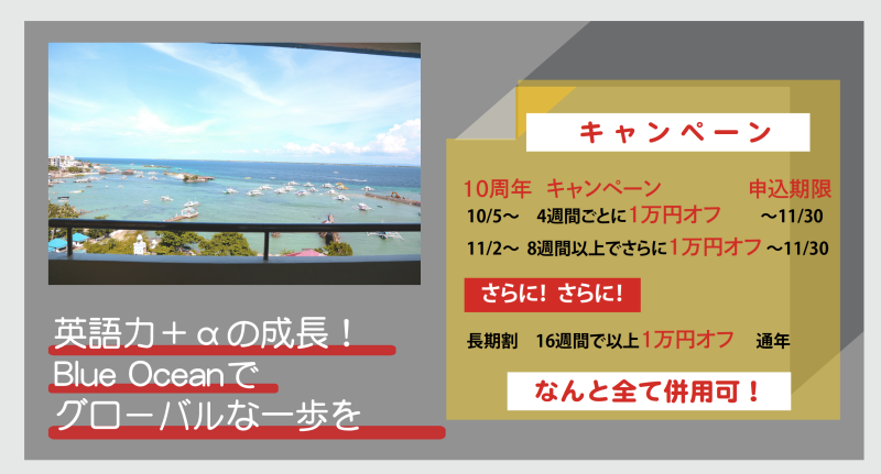 Cebu Blue Ocean Academyの10周年記念キャンペーン第4弾は、11月30日