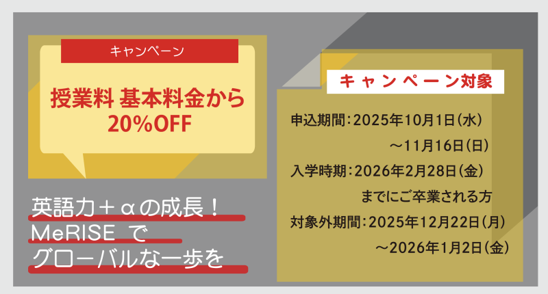 【MeRISE英語学校】Autumn & Winter 20%割引 キャンペーン|大人留学