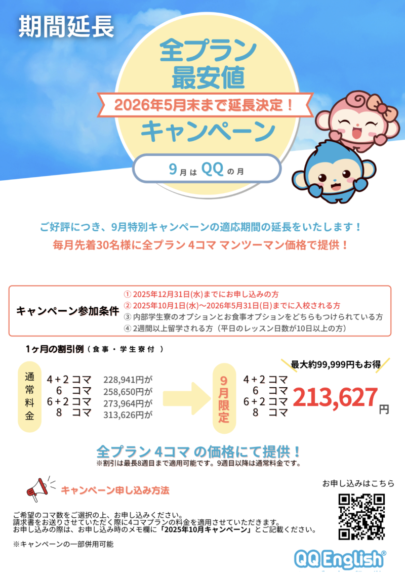 QQ English 入学金無料&4コマの価格で8コマ学べる!英語も人生もアップグレード!