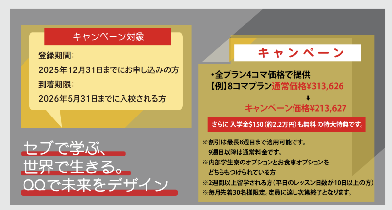 セブ島の人気語学学校 QQ English では、期間限定の「2025-