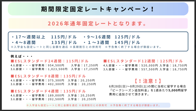 - 4人部屋:留学費用 189,000円/入学金 20,250円