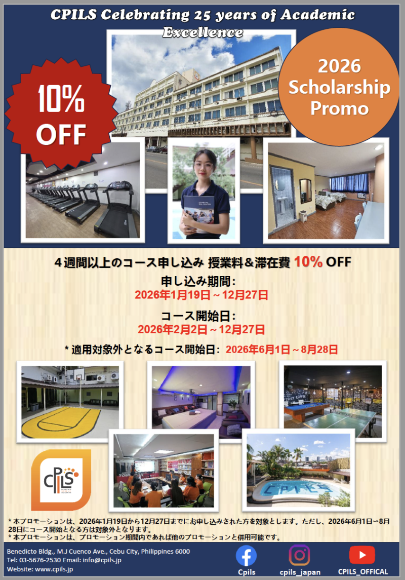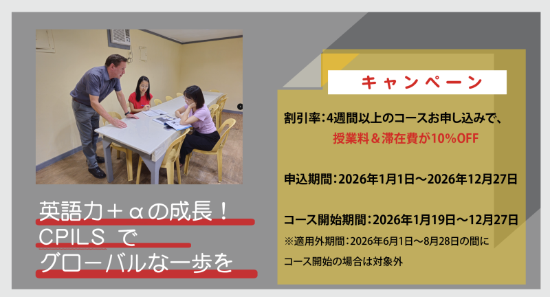 【CPILS】2026.1月〜5月 & 9月〜12月オフシーズンキャンペーン10%OFF!名門校で本気の英語留学