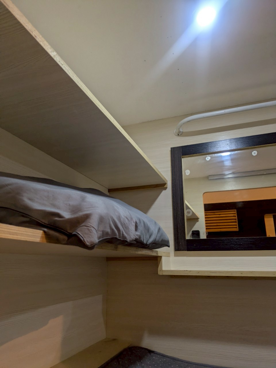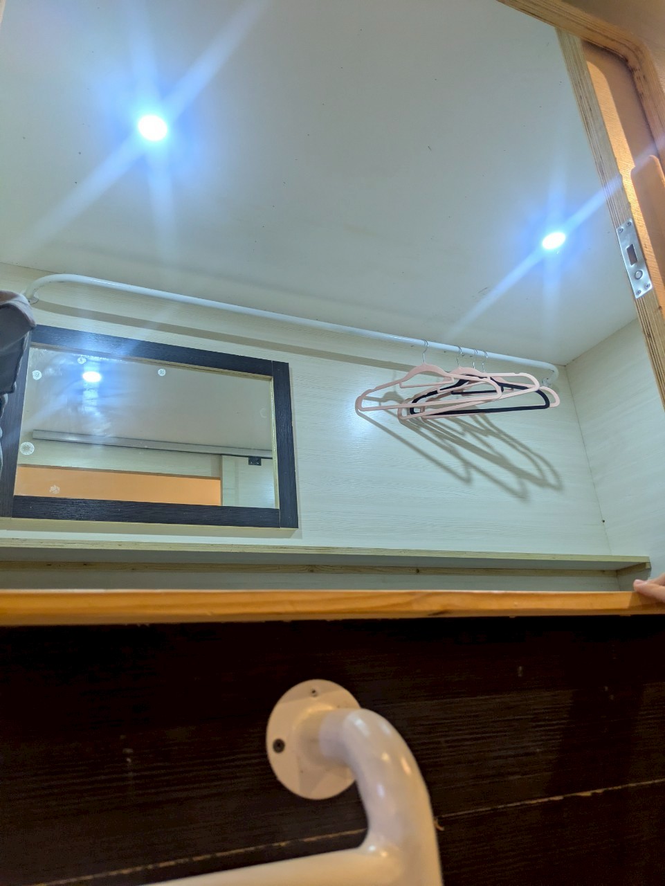 - 鏡、コンセント(通常の電源とUSB型)、マットレス、枕、ブランケット、棚、ライト