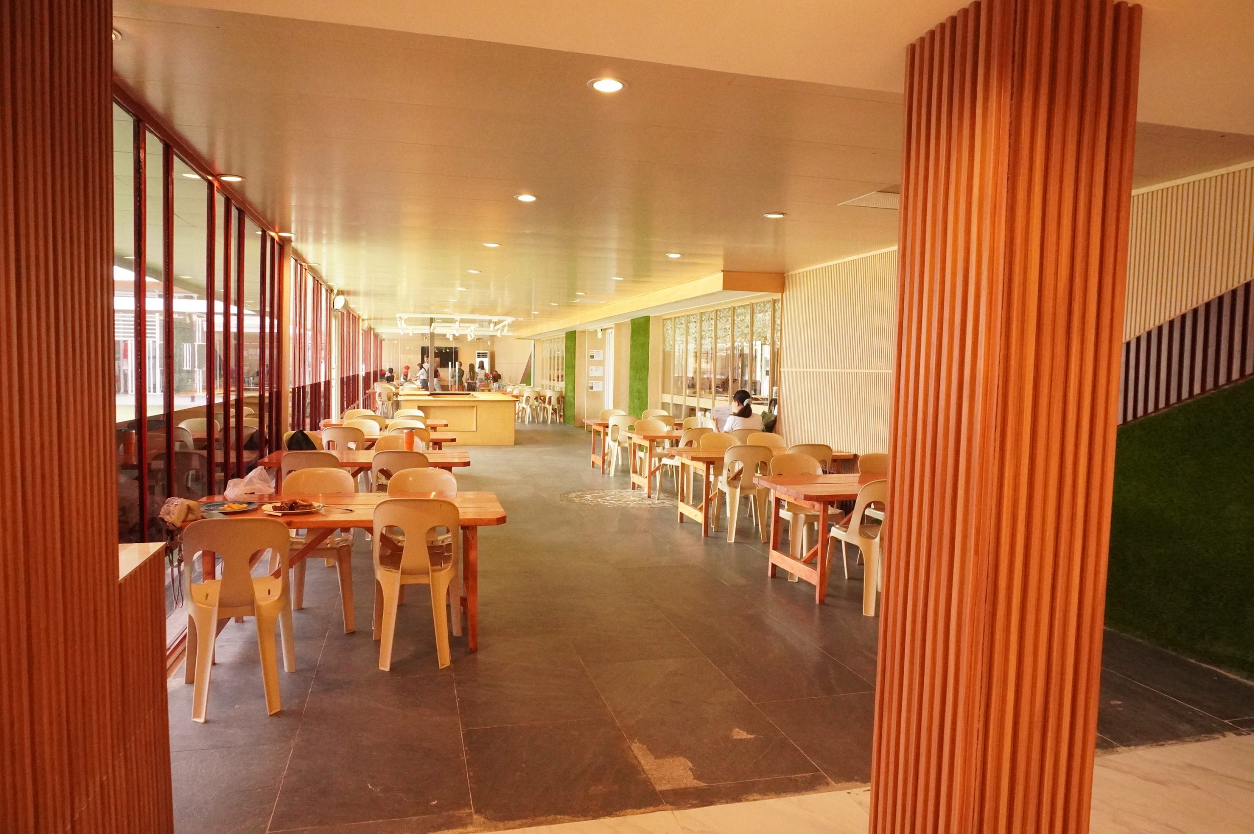キャンパス内の食堂では、無料のビュッフェ形式の食事が提供され、バランスの良いメニューが揃っています。また、オープンテラスの有料レストランもあり、さまざまな食事を楽しめます。