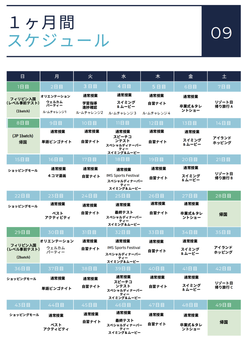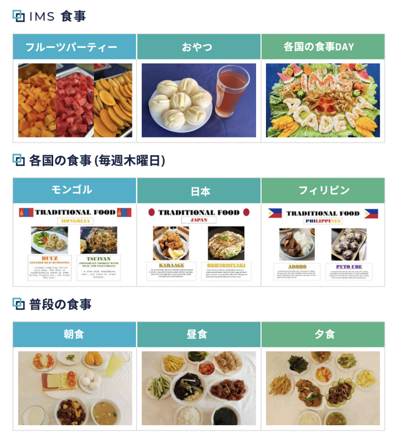 - 食事:1日3食+おやつ付き。週ごとに日本・フィリピン・