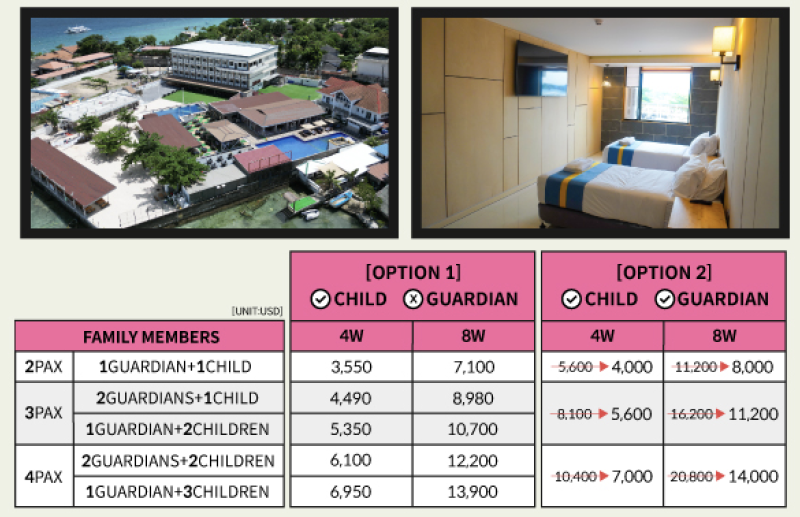 | CELLA Premium | 親子(6歳〜) | 通年 | セブ市内 | 四つ星ホテル改装の寮×都心利便性、レベル別カスタマイズ | 要見積 |