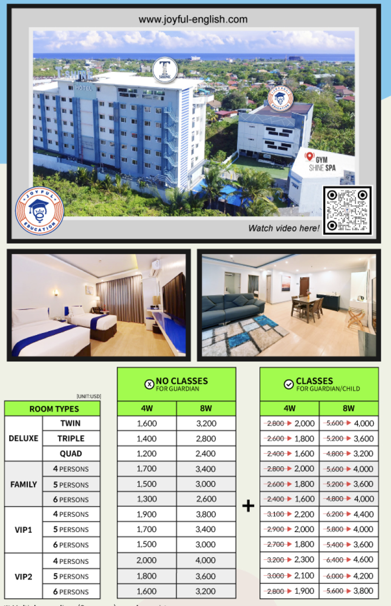 | JOYFUL PREMIUM | 親子(通常5歳〜/オフシーズン4歳〜) | 通年 | セブ | 新築ホテル内で徒歩0分通学、女性にも安心 | 要見積 |