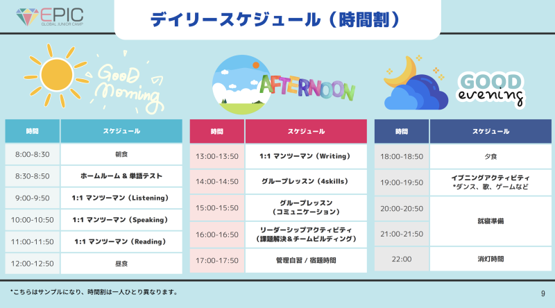 本キャンプは、マンツーマン+少人数制レッスンを中心に、