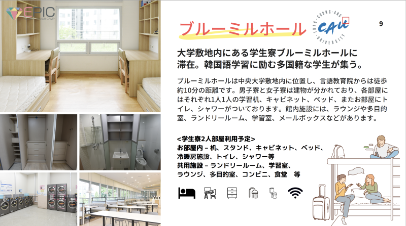 仁川空港到着から帰国まで同行し、学生寮にも滞在します。 - 日本語での生活・学習サポート