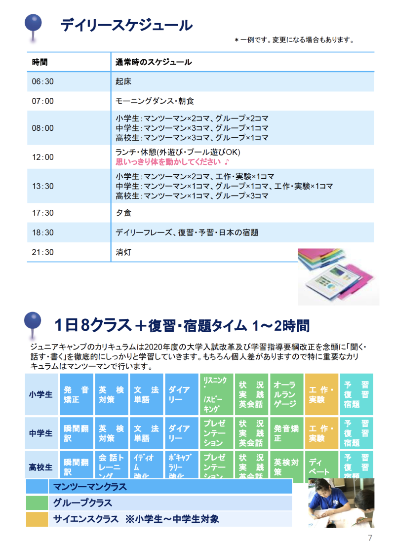① 毎日8時間の本格英語レッスン+日本の宿題サポート