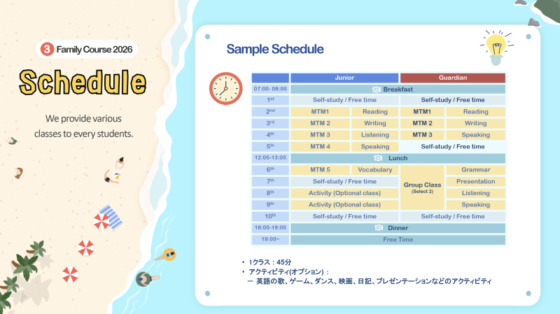 朝食→授業→昼食→午後クラス→自由時間→夕食→フリータイム、