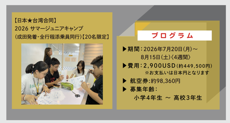 【WINNING日本×台湾合同!サマーキャンプ】成田発着 日本人添乗員同行!(7/20〜8/15)小4〜高3 国際交流×英語力アップ!2週間!